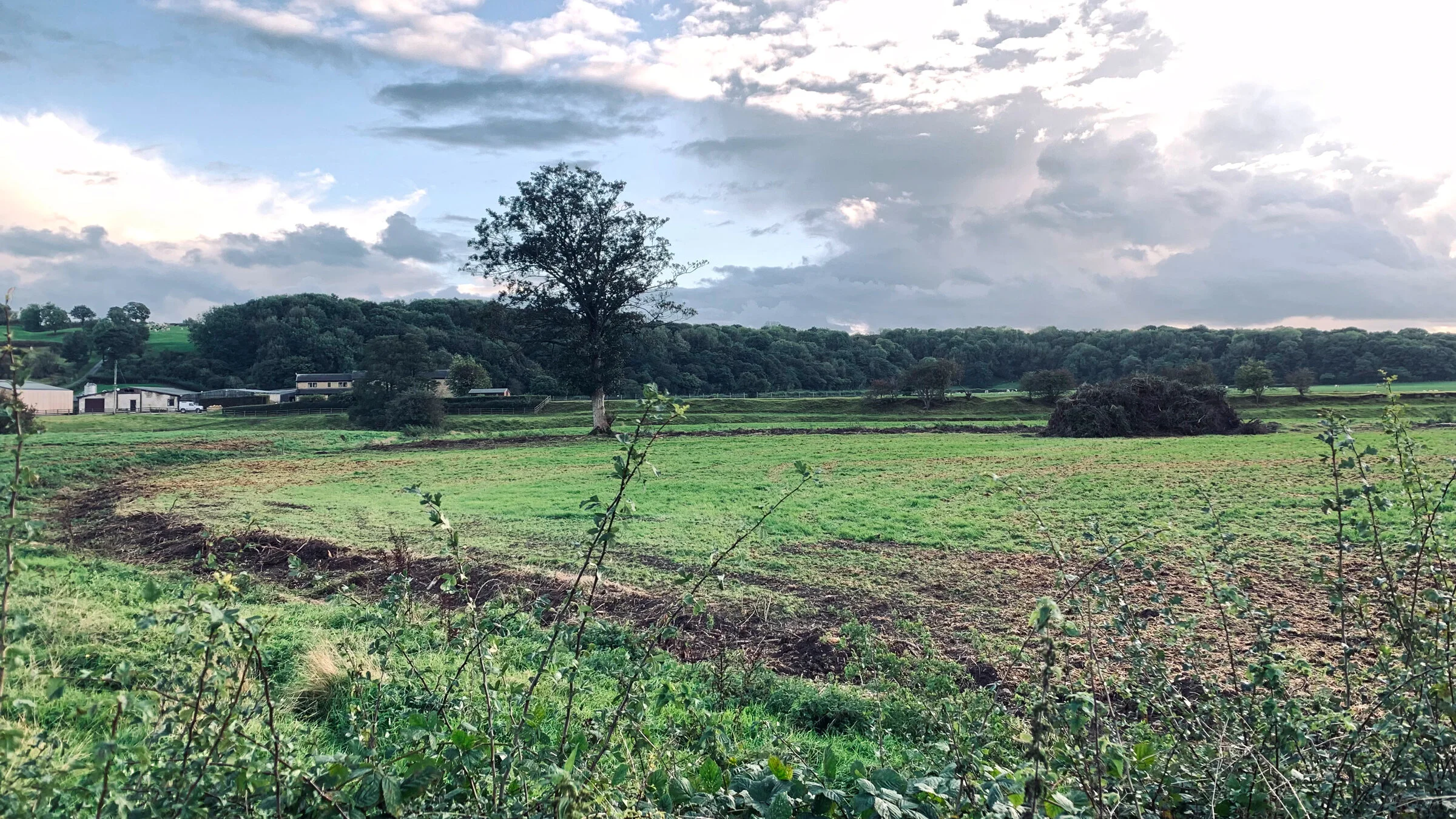 Looking south from Shorton Lane, Ribchester towards Osbaldeston Hall. The remnants of a hedgerow that was shown on the 1888 Ordnance Survey map and was probably hundreds of years old on the left. The fact that it was curved and not straight suggested that it was very old indeed.